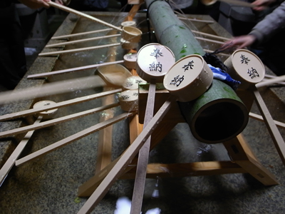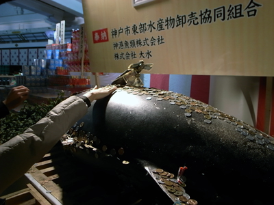 縁起の良いマグロにお賽銭をのせ